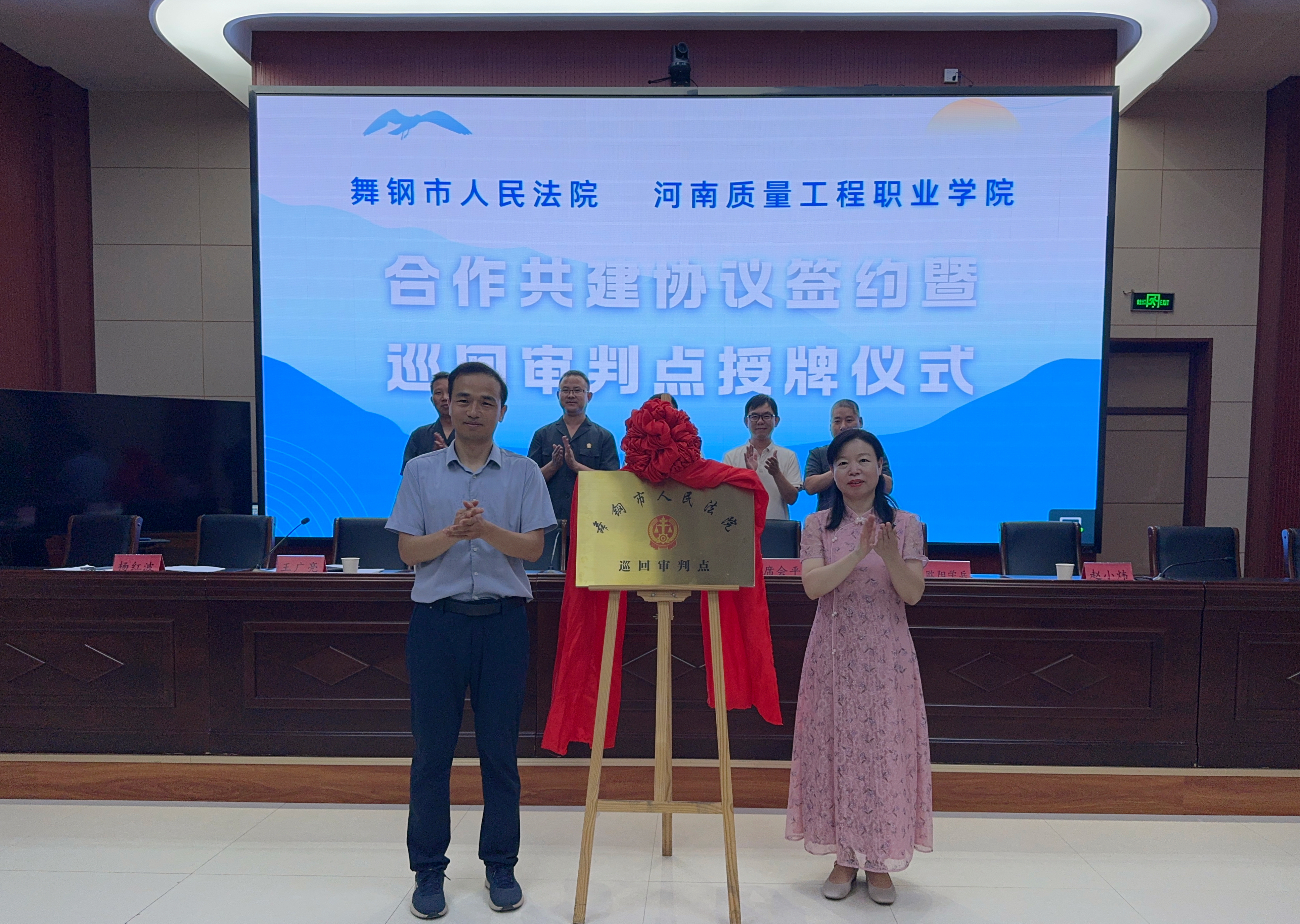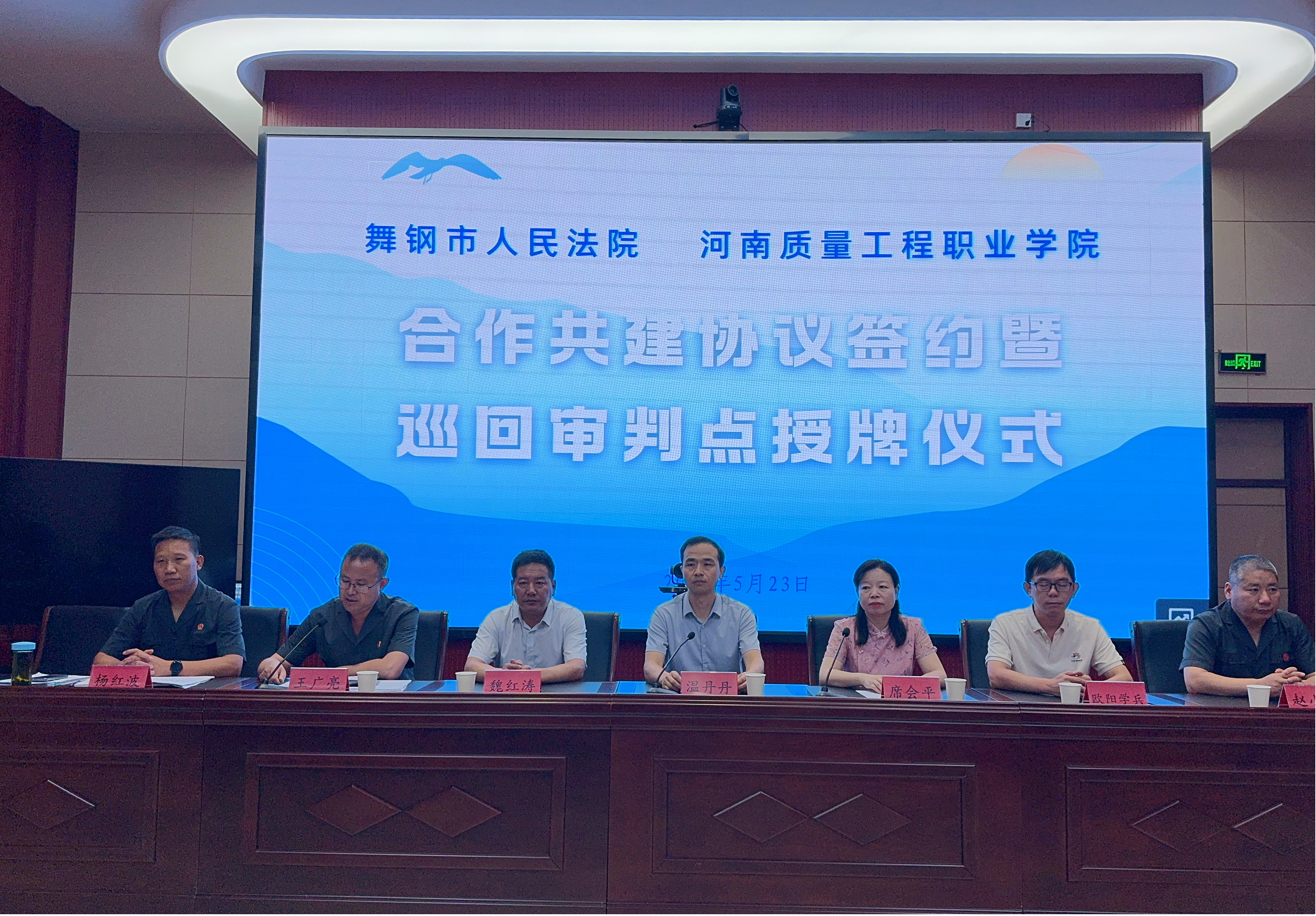 为加强公共管理学院实践教学和教育教学全过程育人,充分发挥高等院校的理论优势和基层法院的实践优势,构建新形势下双向促进、共同提高立德树人新格局。2024年5月23日上午,tyc234cc太阳成集团副院长席会平、舞钢校区管委会副主任魏红涛、公共管理学院院长欧阳学兵、副院长张士红、副院长黄昕及法律事务专业课教师、学生代表一行前往舞钢市人民法院,代表公共管理学院与舞钢市人民法院进行了合作共建签约、巡回审判点授牌仪式。本次活动得到了舞钢市人民法院的高度重视,舞钢市人民法院党组书记、院长温丹丹、党组成员、副院长王广亮等热情接待了我院与会人员。