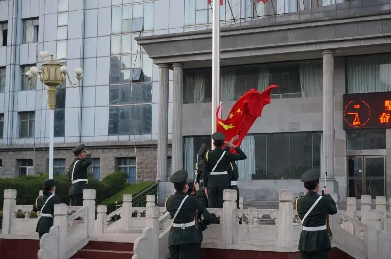 朝阳升起,阳光洒满大地,七时整,升国旗仪式正式开始,在师生的注目下,英姿飒爽的国旗护卫队迈着铿锵有力的步伐走向升旗台。“奏国歌,升国旗,向国旗行注目礼!”伴随着嘹亮的歌声五星红旗冉冉升起,迎风飘扬,全体师生肃穆敬礼。