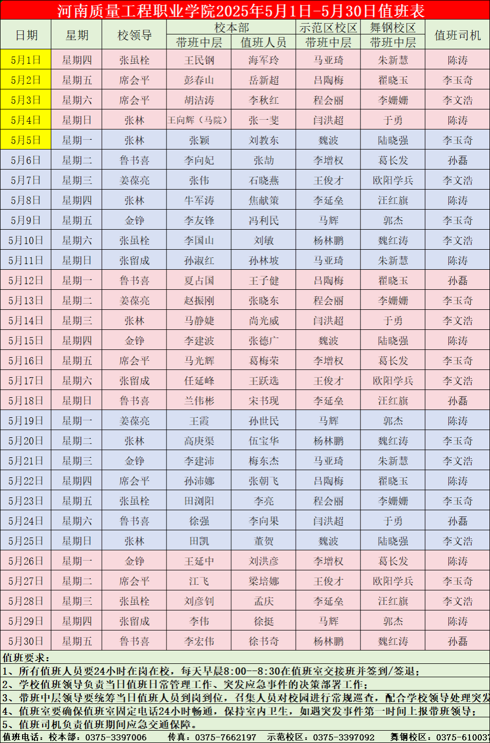 学院2025年5月份值班表