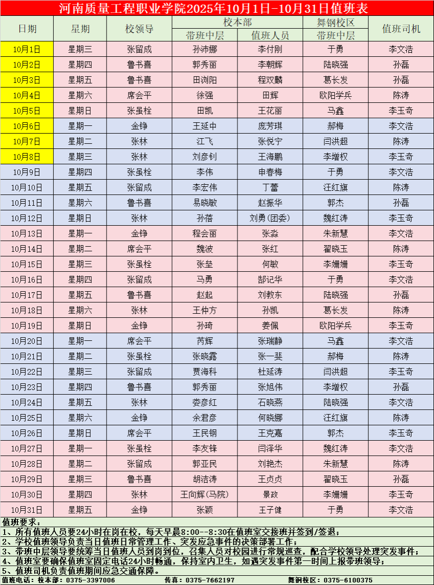 学校2025年10月份值班表