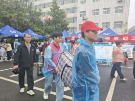 天刚亮迎新现场就很忙碌,穿蓝色志愿服的志愿者早早到位分工布置,报到后又一对一帮新生提行李、带路并解答疑问,用热情细心化解新生陌生感。